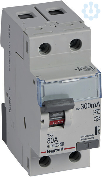 Legrand Fehlerstromschutzschalter TX3, Typ A, für Wechsel- und pulsierende Gleichfehlerströme nach VDE 0664-10, EN 61008-1, unverzögert, 2-polig, Bemessungsstrom In 80 A, Bemessungsfehlerstrom Idn 300 mA, Bemessungsspannung Un 230 VAC, Bemessungsfrequenz 50 Hz, Stoßstromfest bis 250 A, Bemessungskurzschlussstrom 10 kA bei geeigneter Vorsicherung, Befestigung auf Hutprofilschiene EN 60715 durch rastende Schnellbefestigungen, klare Information vorne auf jedem Gerät, eindeutige Schaltstellungsanzeige rot/grün am Schalthebel, mit Beschriftungsfenster, mit Untersteckschutz zum sicheren Einführen des Leiters in Fahrstuhlklemme, Anbau von Hilfsgeräten möglich.