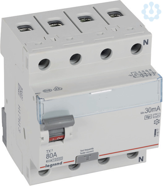 Legrand Fehlerstromschutzschalter TX3, Typ F-G, Mischfrequenzsensitiv nach EN 62423,VDE 0664-10, EN 61008-1, G nach ÖVE E8601, kurzzeitverzögert, verzögert mindestens 10 ms, 4-polig, Bemessungsstrom In 80 A, Bemessungsfehlerstrom Idn 30 mA, Bemessungsspannung Un 400 VAC, Bemessungsfrequenz 50 Hz, Stoßstromfest bis 3000 A, Bemessungskurzschlussstrom 10 kA bei geeigneter Vorsicherung, Befestigung auf Hutprofilschiene EN 60715 durch rastende Schnellbefestigungen, klare Information vorne auf jedem Gerät, eindeutige Schaltstellungsanzeige rot/grün am Schalthebel, mit Beschriftungsfenster, mit Untersteckschutz zum sicheren Einführen des Leiters in Fahrstuhlklemme, Anbau von Hilfsgeräten möglich.