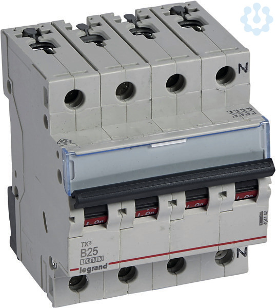Legrand Leitungsschutzschalter TX3 nach EN 60898-1, VDE 0641-11, EN 60947-2, 3-polig mit mitschaltendem Neutralleiter, B-Charakteristik, Bemessungsstrom In 25 A, Bemessungsschaltvermögen Icn10 kA nach EN 60898-1, Bemessungsspannung Un 400 VAC, Bemessungsfrequenz 50/60 Hz, Energiebegrenzungsklasse 3, Befestigung auf Hutprofilschiene EN 60715 durch eine rastende Schnellbefestigung, klare Information vorne auf jedem Gerät, eindeutige Schaltstellungsanzeige rot/grün am Schalthebel, mit Beschriftungsfenster, mit Untersteckschutz zum sicheren Einführen des Leiters in Fahrstuhlklemme, Anbau von Hilfsgeräten möglich. Leitungsschutzschalter mit B-Charakteristik sind vornehmlich für den Leitungsschutz in Licht- und Steckdosen-Stromkreisen bestimmt.
