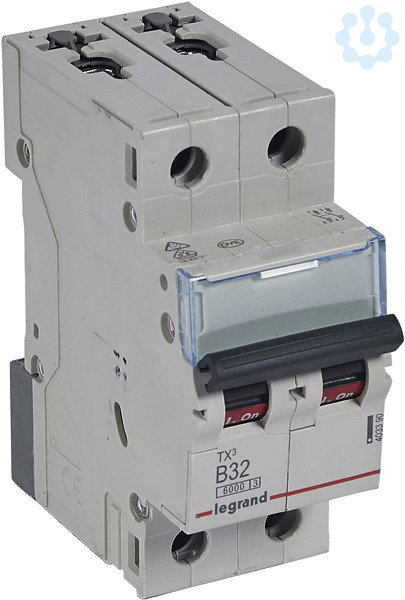 Legrand Leitungsschutzschalter TX3 nach EN 60898-1, VDE 0641-11, EN 60947-2, 2-polig, B-Charakteristik, Bemessungsstrom In 32 A, Bemessungsschaltvermögen Icn 6 kA nach EN 60898-1, Bemessungsspannung Un 400 VAC, Bemessungsfrequenz 50/60 Hz, Energiebegrenzungsklasse 3, Befestigung auf Hutprofilschiene EN 60715 durch eine rastende Schnellbefestigung, klare Information vorne auf jedem Gerät, eindeutige Schaltstellungsanzeige rot/grün am Schalthebel, mit Beschriftungsfenster, mit Untersteckschutz zum sicheren Einführen des Leiters in Fahrstuhlklemme, Anbau von Hilfsgeräten möglich. Leitungsschutzschalter mit B-Charakteristik sind vornehmlich für den Leitungsschutz in Licht- und Steckdosen-Stromkreisen bestimmt.