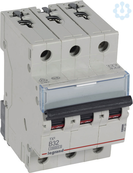 Legrand Leitungsschutzschalter TX3 nach EN 60898-1, VDE 0641-11, EN 60947-2, 3-polig, B-Charakteristik, Bemessungsstrom In 32 A, Bemessungsschaltvermögen Icn 10 kA nach EN 60898-1, Bemessungsspannung Un 400 VAC, Bemessungsfrequenz 50/60 Hz, Energiebegrenzungsklasse 3, Befestigung auf Hutprofilschiene EN 60715 durch eine rastende Schnellbefestigung, klare Information vorne auf jedem Gerät, eindeutige Schaltstellungsanzeige rot/grün am Schalthebel, mit Beschriftungsfenster, mit Untersteckschutz zum sicheren Einführen des Leiters in Fahrstuhlklemme, Anbau von Hilfsgeräten möglich. Leitungsschutzschalter mit B-Charakteristik sind vornehmlich für den Leitungsschutz in Licht- und Steckdosen-Stromkreisen bestimmt.