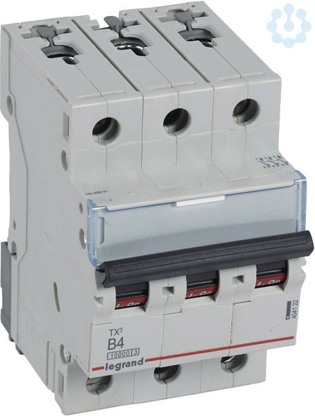 Legrand Leitungsschutzschalter TX3 nach EN 60898-1, VDE 0641-11, EN 60947-2, 3-polig, B-Charakteristik, Bemessungsstrom In 4 A, Bemessungsschaltvermögen Icn 10 kA nach EN 60898-1, Bemessungsspannung Un 400 VAC, Bemessungsfrequenz 50/60 Hz, Energiebegrenzungsklasse 3, Befestigung auf Hutprofilschiene EN 60715 durch eine rastende Schnellbefestigung, klare Information vorne auf jedem Gerät, eindeutige Schaltstellungsanzeige rot/grün am Schalthebel, mit Beschriftungsfenster, mit Untersteckschutz zum sicheren Einführen des Leiters in Fahrstuhlklemme, Anbau von Hilfsgeräten möglich. Leitungsschutzschalter mit B-Charakteristik sind vornehmlich für den Leitungsschutz in Licht- und Steckdosen-Stromkreisen bestimmt.