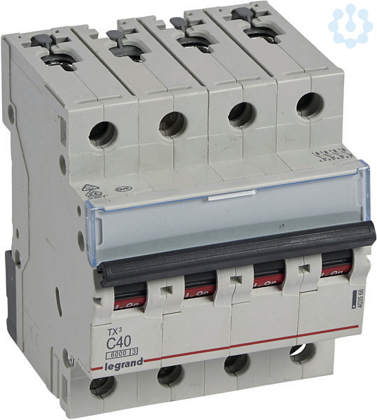 Legrand Leitungsschutzschalter TX3 nach EN 60898-1, VDE 0641-11, EN 60947-2, 4-polig, C-Charakteristik, Bemessungsstrom In 40 A, Bemessungsschaltvermögen Icn 6 kA nach EN 60898-1, Bemessungsspannung Un 400 VAC, Bemessungsfrequenz 50/60 Hz, Energiebegrenzungsklasse 3, Befestigung auf Hutprofilschiene EN 60715 durch eine rastende Schnellbefestigung, klare Information vorne auf jedem Gerät, eindeutige Schaltstellungsanzeige rot/grün am Schalthebel, mit Beschriftungsfenster, mit Untersteckschutz zum sicheren Einführen des Leiters in Fahrstuhlklemme, Anbau von Hilfsgeräten möglich. Leitungsschutzschalter mit C-Charakteristik sind für den Leitungsschutz bei Geräten mit hohen Einschaltströmen (z.B. Motoren und Transformatoren) vorgesehen.