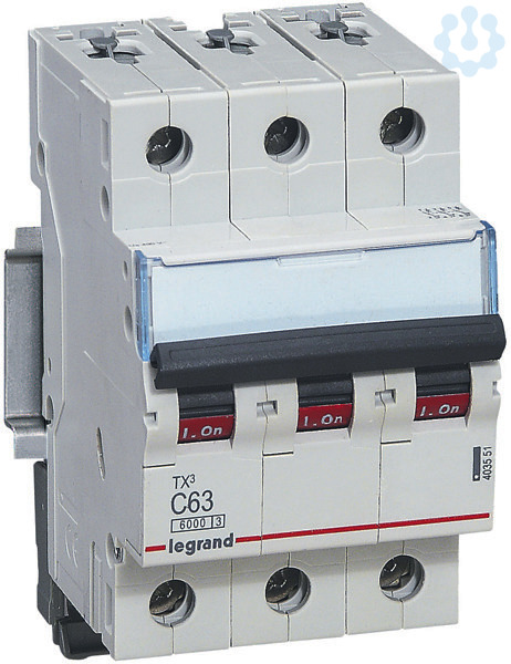 Legrand Leitungsschutzschalter TX3 nach EN 60898-1, VDE 0641-11, EN 60947-2, 3-polig, C-Charakteristik, Bemessungsstrom In 63 A, Bemessungsschaltvermögen Icn 6 kA nach EN 60898-1, Bemessungsspannung Un 400 VAC, Bemessungsfrequenz 50/60 Hz, Energiebegrenzungsklasse 3, Befestigung auf Hutprofilschiene EN 60715 durch eine rastende Schnellbefestigung, klare Information vorne auf jedem Gerät, eindeutige Schaltstellungsanzeige rot/grün am Schalthebel, mit Beschriftungsfenster, mit Untersteckschutz zum sicheren Einführen des Leiters in Fahrstuhlklemme, Anbau von Hilfsgeräten möglich. Leitungsschutzschalter mit C-Charakteristik sind für den Leitungsschutz bei Geräten mit hohen Einschaltströmen (z.B. Motoren und Transformatoren) vorgesehen.