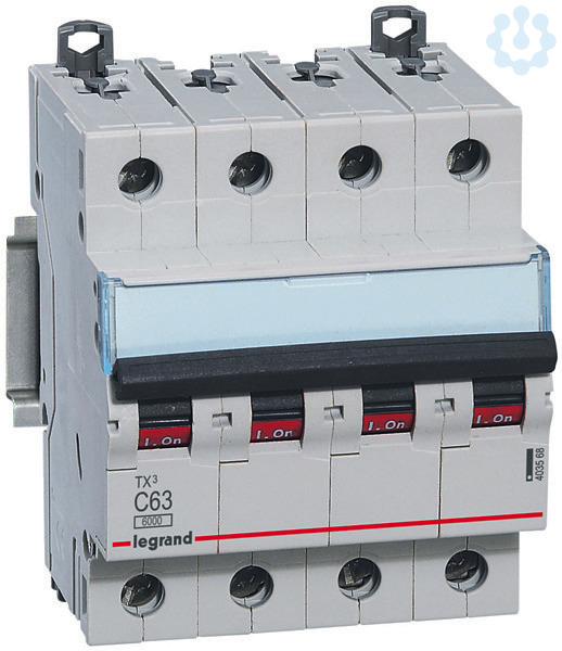 Legrand Leitungsschutzschalter TX3 nach EN 60898-1, VDE 0641-11, EN 60947-2, 4-polig, C-Charakteristik, Bemessungsstrom In 63 A, Bemessungsschaltvermögen Icn 6 kA nach EN 60898-1, Bemessungsspannung Un 400 VAC, Bemessungsfrequenz 50/60 Hz, Energiebegrenzungsklasse 3, Befestigung auf Hutprofilschiene EN 60715 durch eine rastende Schnellbefestigung, klare Information vorne auf jedem Gerät, eindeutige Schaltstellungsanzeige rot/grün am Schalthebel, mit Beschriftungsfenster, mit Untersteckschutz zum sicheren Einführen des Leiters in Fahrstuhlklemme, Anbau von Hilfsgeräten möglich. Leitungsschutzschalter mit C-Charakteristik sind für den Leitungsschutz bei Geräten mit hohen Einschaltströmen (z.B. Motoren und Transformatoren) vorgesehen.