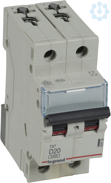Legrand Leitungsschutzschalter TX3 nach EN 60898-1, VDE 0641-11, EN 60947-2, 2-polig, D-Charakteristik, Bemessungsstrom In 20 A, Bemessungsschaltvermögen Icn 6 kA nach EN 60898-1, Bemessungsspannung Un 400 VAC, Bemessungsfrequenz 50/60 Hz, Energiebegrenzungsklasse 3, Befestigung auf Hutprofilschiene EN 60715 durch eine rastende Schnellbefestigung, klare Information vorne auf jedem Gerät, eindeutige Schaltstellungsanzeige rot/grün am Schalthebel, mit Beschriftungsfenster, mit Untersteckschutz zum sicheren Einführen des Leiters in Fahrstuhlklemme, Anbau von Hilfsgeräten möglich. Leitungsschutzschalter mit D-Charakteristik sind für den Leitungsschutz in Kraftstromkreisen mit sehr hohen Einschaltströmen vorzusehen (z.B. Schweißtrafos).
