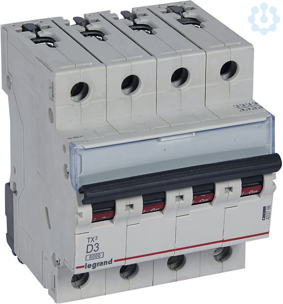Legrand Leitungsschutzschalter TX3 nach EN 60898-1, VDE 0641-11, EN 60947-2, 4-polig, D-Charakteristik, Bemessungsstrom In 3 A, Bemessungsschaltvermögen Icn 6 kA nach EN 60898-1, Bemessungsspannung Un 400 VAC, Bemessungsfrequenz 50/60 Hz, Energiebegrenzungsklasse 3, Befestigung auf Hutprofilschiene EN 60715 durch eine rastende Schnellbefestigung, klare Information vorne auf jedem Gerät, eindeutige Schaltstellungsanzeige rot/grün am Schalthebel, mit Beschriftungsfenster, mit Untersteckschutz zum sicheren Einführen des Leiters in Fahrstuhlklemme, Anbau von Hilfsgeräten möglich. Leitungsschutzschalter mit D-Charakteristik sind für den Leitungsschutz in Kraftstromkreisen mit sehr hohen Einschaltströmen vorzusehen (z.B. Schweißtrafos).