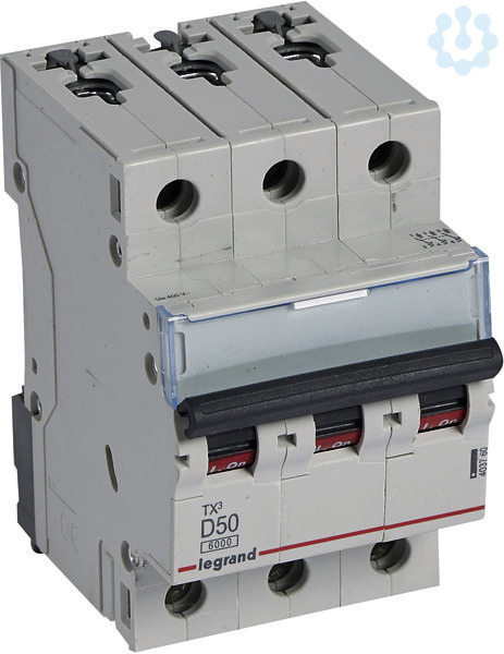 Legrand Leitungsschutzschalter TX3 nach EN 60898-1, VDE 0641-11, EN 60947-2, 3-polig, D-Charakteristik, Bemessungsstrom In 50 A, Bemessungsschaltvermögen Icn 6 kA nach EN 60898-1, Bemessungsspannung Un 400 VAC, Bemessungsfrequenz 50/60 Hz, Energiebegrenzungsklasse 3, Befestigung auf Hutprofilschiene EN 60715 durch eine rastende Schnellbefestigung, klare Information vorne auf jedem Gerät, eindeutige Schaltstellungsanzeige rot/grün am Schalthebel, mit Beschriftungsfenster, mit Untersteckschutz zum sicheren Einführen des Leiters in Fahrstuhlklemme, Anbau von Hilfsgeräten möglich. Leitungsschutzschalter mit D-Charakteristik sind für den Leitungsschutz in Kraftstromkreisen mit sehr hohen Einschaltströmen vorzusehen (z.B. Schweißtrafos).