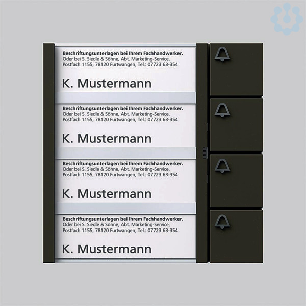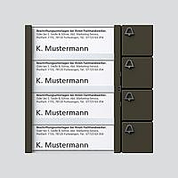 Tasten-Modul mit Namensschildtasche, 4 Namensschildern und 4 separaten Ruftasten mit Glockensymbol.