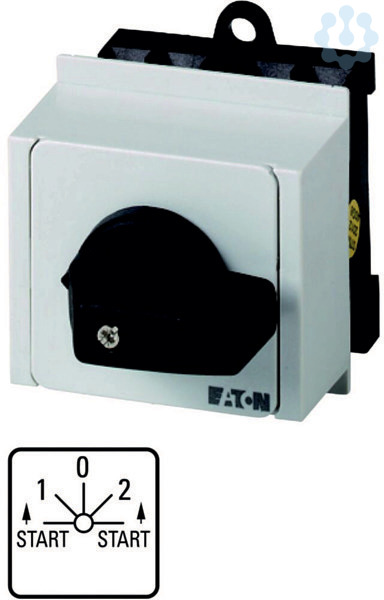 Tastschalter, Sortiment: Steuerschalter, Normen und Bestimmungen: IEC/EN 60947, VDE 0660, IEC/EN 60204, CSA, UL, Lasttrennschalter nach IEC/EN 60947-3, Typkenner: T0, mit schwarzem Knebel und Frontschild, Kontakte: 4, Tastfunktion: Tastfunktion in Stellung START, Schutzart: Front IP30, Bauform: Verteilereinbau, Schaltwinkel: 45 °, Schaltverhalten: tastend/rastend, mit 0-Stellung, mit 2-seitigem Rückzug, 2 Baueinheit(en), Bemessungsdauerstrom: Iu= 20 A, Frontschild: START>1-0-2<START