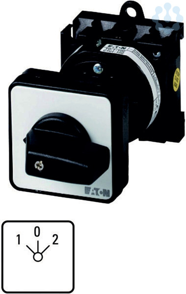 Tastschalter, Sortiment: Steuerschalter, Normen und Bestimmungen: IEC/EN 60947, VDE 0660, IEC/EN 60204, CSA, UL, Lasttrennschalter nach IEC/EN 60947-3, Typkenner: T0, mit schwarzem Knebel und Frontschild, Kontakte: 4, Schutzart: Front IP65, Bauform: Zwischenbau, Schaltwinkel: 45 °, Schaltverhalten: tastend/rastend, mit 0-Stellung, mit 2-seitigem Rückzug, 2 Baueinheit(en), Bemessungsdauerstrom: Iu= 20 A, Frontschild: START>2-0-1<START