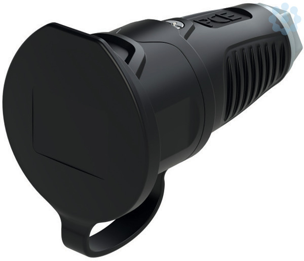 Schutzkontaktkupplung Serie TAURUS2 - Gummi mit Deckelband; Farbe (Haube/Ring/Deckel): schwarz/grau/schwarz; Material (Haube/Kontaktträger): TPE/PA6; Schutzkontaktsystem: franz./belg. mit Shutter; 16A / 250V AC / 3p (2P+E), Schutzart: IP54