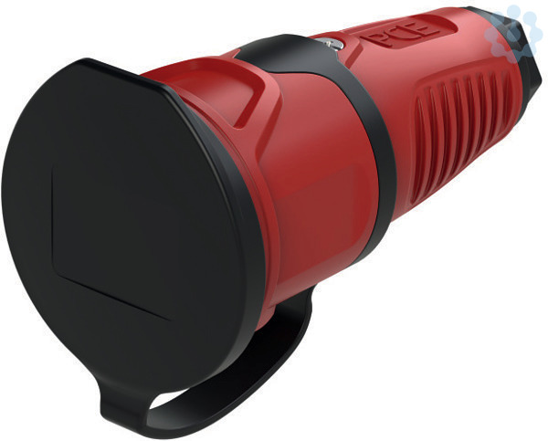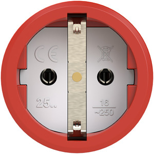 Schutzkontaktkupplung Serie TAURUS2 - Gummi mit Deckelband; Farbe (Haube/Ring/Deckel): rot/schwarz/schwarz; Material (Haube/Kontaktträger): TPE/PA6; Schutzkontaktsystem: österr./deutsch ; 16A / 250V AC / 3p (2P+E), Schutzart: IP54