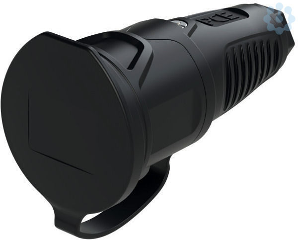 Schutzkontaktkupplung Serie TAURUS2 - Gummi mit Deckelband; Farbe (Haube/Ring/Deckel): schwarz/schwarz/schwarz; Material (Haube/Kontaktträger): TPE/PA6; Schutzkontaktsystem: österr./deutsch ; 16A / 250V AC / 3p (2P+E), Schutzart: IP54
