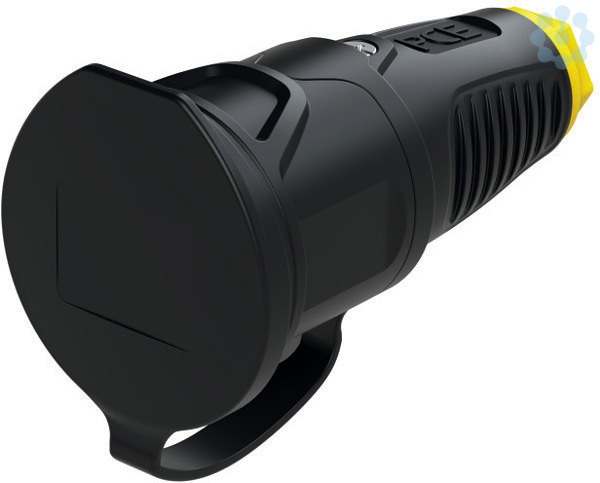 Schutzkontaktkupplung Serie TAURUS2 - Gummi mit Deckelband; Farbe (Haube/Ring/Deckel): schwarz/gelb/schwarz; Material (Haube/Kontaktträger): TPE/PA6; Schutzkontaktsystem: österr./deutsch mit Shutter; 16A / 250V AC / 3p (2P+E), Schutzart: IP54