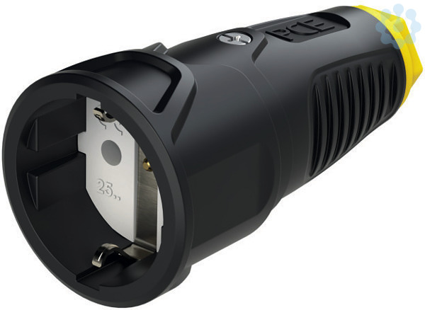 Schutzkontaktkupplung Serie TAURUS2 - Gummi; Farbe (Haube/Ring): schwarz/gelb; Material (Haube/Kontaktträger): TPE/PA6; Schutzkontaktsystem: österr./deutsch ; 16A / 250V AC / 3p (2P+E), Schutzart: IP20