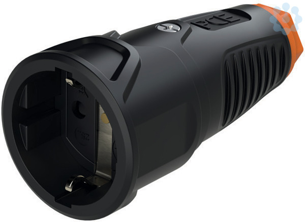 Schutzkontaktkupplung Serie TAURUS2 - Gummi; Farbe (Haube/Ring): schwarz/orange; Material (Haube/Kontaktträger): TPE/PA6; Schutzkontaktsystem: österr./deutsch mit Shutter; 16A / 250V AC / 3p (2P+E), Schutzart: IP20