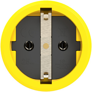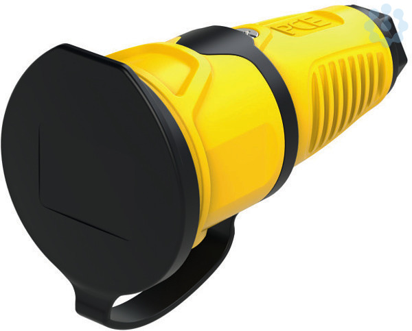 Schutzkontaktkupplung Serie TAURUS2 - Vollgummi mit Deckelband; Farbe (Haube/Ring/Deckel): gelb/schwarz/schwarz; Material (Haube/Kontaktträger): TPE/TPE; Schutzkontaktsystem: österr./deutsch ; 16A / 250V AC / 3p (2P+E), Schutzart: IP54