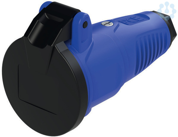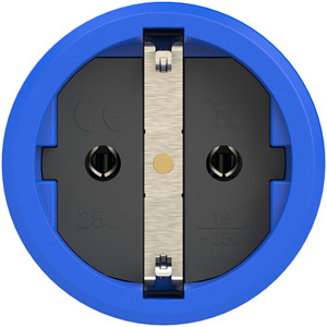 Schutzkontaktkupplung Serie TAURUS2 - Vollgummi mit Klappdeckel; Farbe (Haube/Ring/Deckel): blau/schwarz/schwarz; Material (Haube/Kontaktträger): TPE/TPE; Schutzkontaktsystem: österr./deutsch ; 16A / 250V AC / 3p (2P+E), Schutzart: IP54