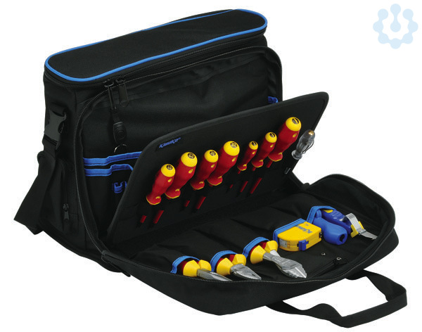 Techniker Grundausstattung, überwiegend bestückt mit VDE-Werkzeugen. Techniker Notebook Werkzeugtasche, Material: hochstrapazierfähiges Nylon. 90° aufklappbare Vordertasche. Hochwertige Reissverschlüsse. Spritzwassergeschützter Boden. Seitlich je eine Tasche mit Reissverschluss. Verstellbarer Tragegurt mit Schnellverschluss und Schulterauflage. Doppelter fixierbarar Tragegriff. Einschub für Visitenkarten. Lieferumfang: Techniker-Profitasche, leer (KL905L), VDE-Phillips-Schraubendreher, PH1 (KL110PH1IS), VDE-Phillips-Schraubendreher, PH2 (KL110PH2IS), VDE-Schlitz-Schraubendreher, 2,5 x 0,4 mm (KL1007525IS), VDE-Schlitz-Schraubendreher, 4,0 x 0,8 mm (KL10010040IS), VDE-Schlitz-Schraubendreher, 5,5 x 1,0 mm (KL10012555IS), Phasenprüfer mit Kraftformheft, einpolig, VDE 0680 150V - 250V (KL19073IS), VDE-Plus/Minus-Schraubendreher, Z1 (KL130PM1IS), VDE-Plus/Minus-Schraubendreher, Z2 (KL130PM2IS), Kabelmesser, mit Hakenklinge (KL745HK), VDE-Telefonzange, gerade, 205 mm (KL050205IS), VDE-Kraftseitenschneider (KL044200IS), Rundkabel-Entmantler 8 - 13mm² (KL710), VDE-Kraft-Kombizange 165 mm (KL020165IS), Taschenbandmaß, 3 m (KL403).