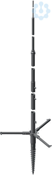 Tele-Blitzschutzmast mit Schraubfundament, geprüft nacht DIN EN 62561-(1+2). Zum Schutz vor direktem Blitzeinschlag bei besonderen Anlagen z. B. Biogas-Anlagen, PV-Anlagen auf Freiflächen. Die Tele-Blitzschutzmaste mit Schraubfundament sind nach Eurocode 1 (DIN EN 1991-1-4 + DIN EN 1991-1-4/NA) für eine max. Böenwindgeschwindigkeit von 177 km/h dimensioniert Die Maste werden im Schraubfundament errichtet und somit sind keine Grabungsarbeiten bzw. Gründungsarbeiten notwendig. Das Schraubfundament wird ohne besonderes Vorbereiten einfach in den gewachsenen Boden geschraubt und mit Tiefenerdern zusätzlich fixiert. Ausführung Höhe 8000 mm über Flur.