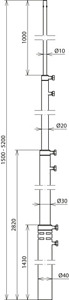 Teleskopierbare Fangstange zum Schutz von Dachaufbauten, zur Befestigung z. B. an Wänden, im Stativ oder sonstigen Konstruktionen. Stange bestehend aus vier Segmenten, Ø40 mm bis Ø10 mm Fangspitze, Länge ausziehbar bis 5200 mm.