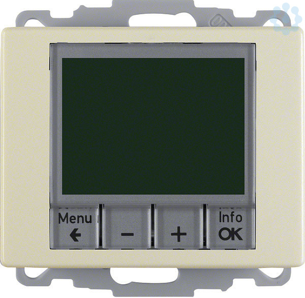 Temperaturregler, Schließer, mit Z.-Stk., zeitgesteuert Arsys weiß, glänzend. Temperaturregler, Schließer, mit Zentralstück, zeitgesteuert, Anpassung des Heizbedarf an individuellen Lebensgewohnheiten durch Regelung der Raumtemperatur abhängig von Uhrzeit und Wochentag (Programm), mit Aufdruck. Für Heiz- oder Kühlbetrieb. Für Raum- und Fußbodenheizungen, mit integriertem Temperaturfühler, bei Fußbodenheizung, Regelung mittels Raum- und/oder externem Temperaturregler möglich, mit zusätzlichem Anschluss für externen Fußbodentemperatur-/Fernfühler, großflächiges, hintergrundbeleuchtetes Display mit Textanzeige, Bedienersprachen einstellbar: Deutsch, Englisch, Niederländisch oder Französisch, max. 9 Schaltzeiten pro Wochentag, 3 voreingestellte Zeitprogramme individuell anpassbar, programmierbar mit abgenommenem Bedienteil, mit Umschaltung Hand-/Automatikbetrieb, mit automatischer Sommer-/Winterzeit-Umschaltung (abschaltbar), Regelbereich der Temperatur einstellbar, mit manueller Temperaturwertanpassung, Timer für stundenweise Änderung der Temperatur, Urlaubsprogramm mit Datumsaktivierung, Betriebsstundenzähler oder Energieverbrauchsanzeige einstellbar, mit Ventilschutzfunktion, mit Frostschutzfunktion, mit Zugriffsschutz, Reglerverfahren PWM oder 2-Punkt (Ein/Aus) wählbar, PWM-Zykluszeit und Hysterese (bei Zweipunktregelung) einstellbar, Art des Stellantriebs (stromlos geschlossen/offen) einstellbar, mit selbstlernender Heizkurve, ohne Spreizkrallen, mit Schraubklemmen, Neutralleiter erforderlich.