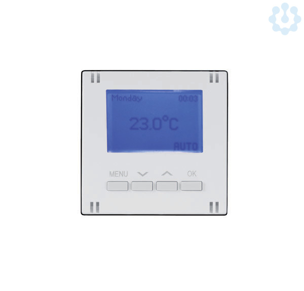Temperaturregleraufsatz digital, Farbe weiß, Abdeckung für Einsatz 90500490-DE, Steuerungseinheit mit Zentralscheibe 50x50mm, passend für alle gängigen Schalterfabrikate in Verbindung mit Zwischenrahmen, zur Montage auf Thermostateinsatz, mit beleuchtetem Display mit Anzeige von Temperatur, Wochentag, Uhrzeit und Betriebsmodus, Tages- und Wochenprogramm für 3 Betriebsmodi: Standard, Komfort- und Nachtmodus, automatischer Sommer- Winterzeitumstellung, programmierbare Displaybeleuchtung, Spracheinstellung und Frostschutzfunktion +5°C, Temperaturbereich +5°C bis +30°C, Schaltdifferenz 1K, IP20