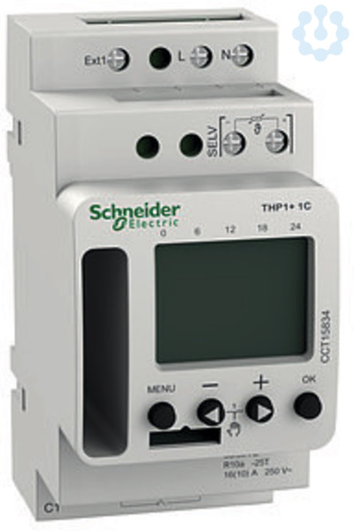 Digitales Uhrenthermostat mit 1 Kanal zur Überwachung und Regelung der Raumtemperatur. Die 42 Tages-/Wochenprogramme sind minutengenau einstellbar. Über die optionale Speicherkarte (CCT15861) können die gespeicherten Schaltzeiten und Geräteeinstellung ein- oder ausgelesen werden. Für die Anpassung der Solltemperatur, kann zusätzlich ein nicht regelbarer Temperatursensor (15835) oder ein regelbarer Temperatursensor (15836) angeschlossen werden. Kurzanleitung im Aufbewahrungsfach. Für die Montage auf Hutschienen TH35. nach EN 60715. Funktionen -42 Speicherplätze. Solltemperaturverstellung der Modi Komfort, Absenken, Frost. Einstellbereich Temperatur + 6 GradC &x2026, + 30 GradC. Dauerschaltung EIN/AUS. Handschaltung. Externer Eingang Schalter anschließbar (Aktivierung eines Modus). Ferienprogramm mit zeit-genauer Einstellung. Wandabgleich Einstellung eines Temperatur-Offsets. Übersichtliche Anzeige der Programme im LCD-Display. Sommer-/Winterzeitumschaltung Automatisch, deaktivierbar, Umschaltregeln für Europa, USA und weitere Länder sind bereits hinterlegt, eigene Umschaltregel oder Umschaltung nach fixem Datum wählbar. PIN-Codierung. Nennspannung AC 230,-15 %/+10 %, 50/60 Hz. Standby-Leistung 0,8 W. Anzahl Kanäle 1, Wechsler. Schaltleistung max 10 A, AC 250 V, cos phi1, 2 A, AC 250 V, cos phi0,6. Schaltleistung min 10 mA, AC 230 V, 100 mA, AC/DC 24 V. Sensortyp NTC, Sensorlänge max. 50 m. Externe Eingänge 1. Anschlüsse Schraubklemmen, starr/flexibel 2x0,5 - 2,5 mm2, mit Aderendhülse max. 1x2,5 mm2. Bedienelemente 4 Tasten zur Menüführung. Ganggenauigkeit 7+/-0,25 s/Tag (25 GradC). Gangreserve10 Jahre. Schutzart Gerät IP 20. Gerätebreite 2,5 TE ca. 45 mm.