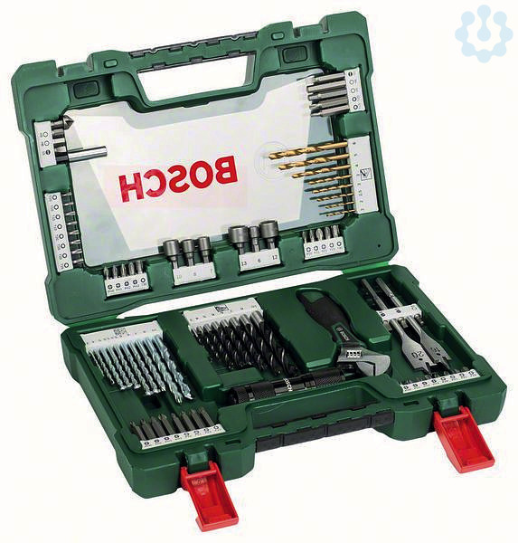 V-Line Box, 83-teilig, 6 x 83-teiliges V-Line Bohrer- und Bit-Set, Inhalt eines Sets: LED-Taschenlampe und Rollgabelschlüssel, 8 Metallbohrer HSS-TiN mit Durchmesser von 2 bis 6 mm, 10 Steinbohrer mit Durchmesser von 3 bis 10 mm, 8 Holzbohrer mit Durchmesser von 3 bis 10 mm, 2 Flachfräsbohrer mit Durchmesser von 16 und 20 mm, 13 Schrauberbits mit Länge: 50 mm, PH 0 / 1 / 2 / 3, PZ 0 / 1 / 2 / 3, S 5, T 15 / 20, H 5 / 6, 32 Schrauberbits mit Länge: 25 mm, PH 0 / 0 / 1 / 1 / 2 / 2 / 3 / 3 , PZ 0 / 0 / 1 / 1 / 2 / 2 / 3 / 3, S 4 / 5 / 6, T 10 / 10 / 15 / 15 / 20 / 20 / 25 / 25 / 30 / 40, H 4 / 5 / 6, 6 Steckschlüssel mit Durchmesser 6 / 7 / 8 / 10 / 12 / 13 mm, Kegelsenker und magnetischer Bithalter.