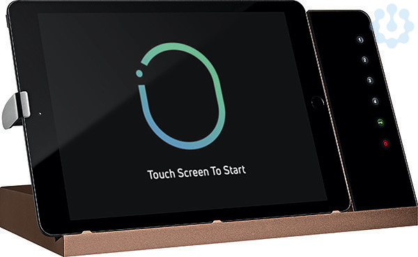 Tisch-Dockingstation mit Ladefunktion, iPad-Verriegelung und Steuerungsfunktionalität, Gehäuse apricot, Glas schwarz, Lightning Anschluss, inklusive POE+ Injektor, Audio Ausgang, USB-A Ausgang, kompatibel zu vielen Tablets durch schiebbaren Ladestecker