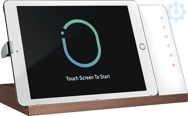 Tisch-Dockingstation mit Ladefunktion, iPad-Verriegelung und Steuerungsfunktionalität, Gehäuse apricot, Glas weiß, Lightning Anschluss, inklusive POE+ Injektor, Audio Ausgang, USB-A Ausgang, kompatibel zu vielen Tablets durch schiebbaren Ladestecker