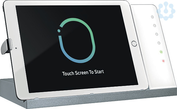 Tisch-Dockingstation mit Ladefunktion und Steuerungsfunktionalität, Gehäuse blau, Glas weiß, Lightning Anschluss, inklusive POE+ Injektor, Audio Ausgang, USB-A Ausgang, kompatibel zu vielen Tablets durch schiebbaren Ladestecker
