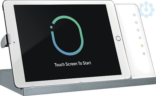 Tisch-Dockingstation mit Ladefunktion, iPad-Verriegelung und Steuerungsfunktionalität, Gehäuse blau, Glas weiß, Lightning Anschluss, inklusive POE+ Injektor, Audio Ausgang, USB-A Ausgang, kompatibel zu vielen Tablets durch schiebbaren Ladestecker