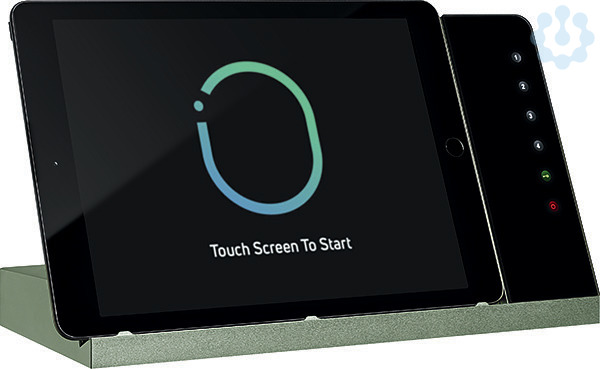 Tisch-Dockingstation mit Ladefunktion und Steuerungsfunktionalität, Gehäuse grün, Glas schwarz, Lightning Anschluss, inklusive POE+ Injektor, Audio Ausgang, USB-A Ausgang, kompatibel zu vielen Tablets durch schiebbaren Ladestecker