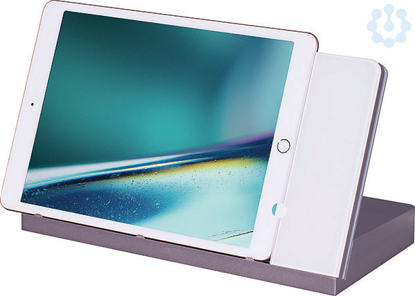 Tisch-Dockingstation mit Ladefunktion, Gehäuse rosé, Glas weiß, Lightning Anschluss, inklusive POE+ Injektor, Audio Ausgang, USB-A Ausgang, kompatibel zu vielen Tablets durch schiebbaren Ladestecker
