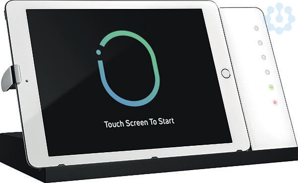 Tisch-Dockingstation mit Ladefunktion, iPad-Verriegelung und Steuerungsfunktionalität, Gehäuse schwarz, Glas weiß, Lightning Anschluss, inklusive POE+ Injektor, Audio Ausgang, USB-A Ausgang, kompatibel zu vielen Tablets durch schiebbaren Ladestecker