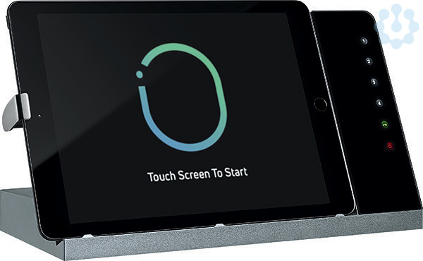 Tisch-Dockingstation mit Ladefunktion, iPad-Verriegelung und Steuerungsfunktionalität, Gehäuse blau, Glas schwarz, Lightning Anschluss, inklusive POE+ Injektor, Audio Ausgang, USB-A Ausgang, kompatibel zu vielen Tablets durch schiebbaren Ladestecker