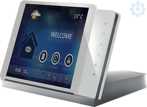Tisch-Dockingstation mit Ladefunktion und Steuerungsfunktionalität, Gehäuse silber, Glas weiß, Lightning Anschluss, inklusive POE+ Injektor, Audio Ausgang, USB-A Ausgang, kompatibel zu vielen Tablets durch schiebbaren Ladestecker