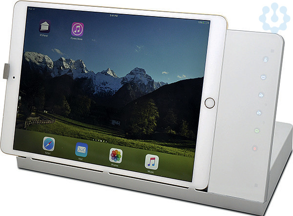 Tisch-Dockingstation mit Ladefunktion, iPad-Verriegelung und Steuerungsfunktionalität, Gehäuse silber, Glas weiß, Lightning Anschluss, inklusive POE+ Injektor, Audio Ausgang, USB-A Ausgang, kompatibel zu vielen Tablets durch schiebbaren Ladestecker