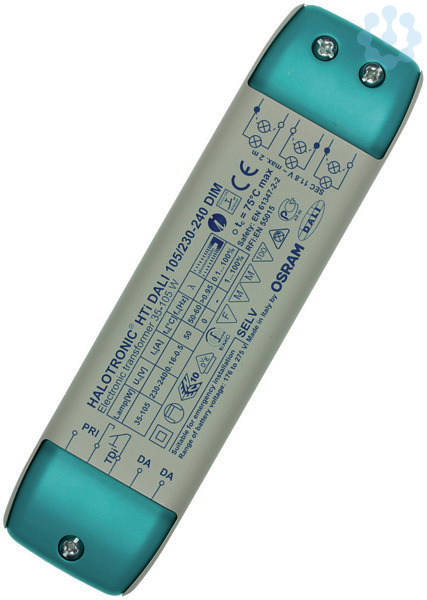 Dimmbare elektronische Trafos für Halogen-Niedervolt-Lampen. Produkteigenschaften: DALI-Trafo für Niedervolthalogenlampen. Galvanische Trennung zwischen Primär- und Sekundärseite. Kurzschlussschutz, Überlastschutz, Übertemperaturschutz: elektronisch reversibel. Sekundärseitiges Schalten zwischen elektronischem Trafo und Lampe nicht zulässig. Energieeffizienz: ≥ 91 % (gemäß ErP-Verordnung 2012/1194/EC). Gerät auch für Spezialanwendungen, die Dimmniveau unter 1 % erfordern, geeignet. Produktvorteile: Minimierter Energieverbrauch durch den hohen Wirkungsgrad. Durchverdrahtung auf der Primärseite möglich. Großer Temperaturbereich. Lampenschonender Betrieb im gesamten Teillastbereich für lange Lampenlebensdauer. Anwendungsgebiete: Effekt- und Akzentbeleuchtung. Wohnzimmer. Objektbeleuchtung. Konferenzräume. Restaurants. Deckeneinbau- und Deckenaufbauleuchten. Shopbeleuchtung. Veranstaltungsräume. Geeignet für Installationen im Innenbereich.