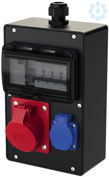 Vollgummi-Verteiler Typ TRAUNSEE IP44 165x260x90 (vert.); 1xM25 Verschraubung oben (Kabeldurchm. 13-18mm PG21) schwarz; 1xBlindverschraubung M25 unten; 1xCEE-Steckdose 16A 5p 400V abgesichert ü. 1xLS 16A 3p C; 1xSK-Steckdose 16A 250V IP54 abgesichert ü. 1xLS 16A 1p C; 1xFI 63A/4/0.03A (TYP A 40AT) über alle Ausgänge; Leitungsschutzschalter und FI Fabrikat Eaton ÖVE / VDE; Verteiler auf Vario-Connector 5polig 10qmm verdrahtet