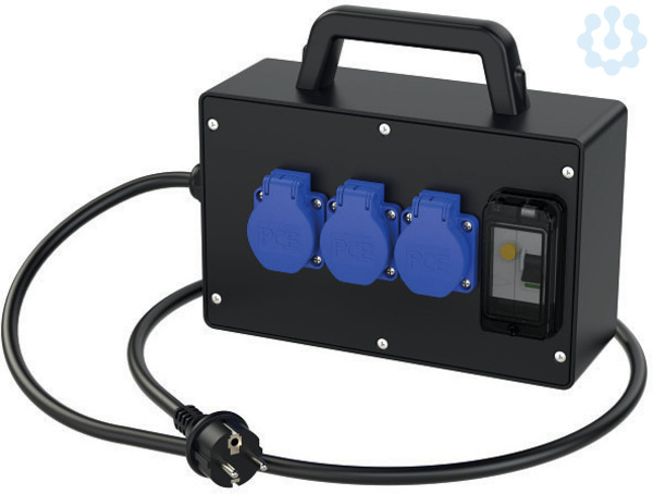 Vollgummi-Verteiler Typ TRAUNSEE IP54 165x260x90 m.Tragegriff; 1,5m Kabel H07RN-F 3G2.5mm2 sw.m.VG-SK-Stecker 16A 2p+PE 230V; 3xSK-Steckdose 16A 250V IP54 abgesichert d. Vorsicherung Zuleitung; 1xFI 25A/2/0.03A (TYP A 25AT) über alle Ausgänge; FI-Schutzschalter Marke PCE Ö+V; Verteiler betriebsfertig angeschlossen