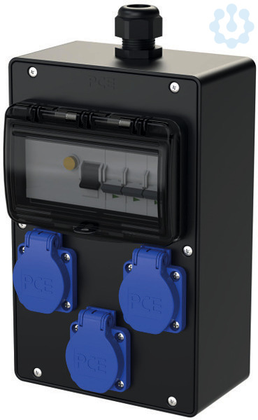 Vollgummi-Verteiler Typ TRAUNSEE IP54 165x260x90 (vert.); 1xM25 Verschraubung oben (Kabeldurchm. 13-18mm PG21) schwarz; 1xBlindverschraubung M25 unten; 3xSK-Steckdose 16A 250V IP54 abgesichert ü. 3xLS 16A 1p C; 1xFI 63A/4/0.03A (TYP A 40AT) über alle Ausgänge; Leitungsschutzschalter und FI Fabrikat Eaton ÖVE / VDE; Verteiler auf Vario-Connector 5polig 10qmm verdrahtet