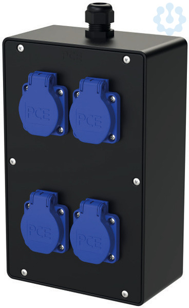 Vollgummi-Verteiler Typ TRAUNSEE IP54 165x260x90 (vert.); 1xM20 Verschraubung oben (Kabeldurchm. 10-14mm PG16) schwarz; 1xBlindverschraubung M20 unten; 4xSK-Steckdose 16A 250V IP54 ungesichert; Verteiler auf Vario-Connector 5polig 10qmm verdrahtet