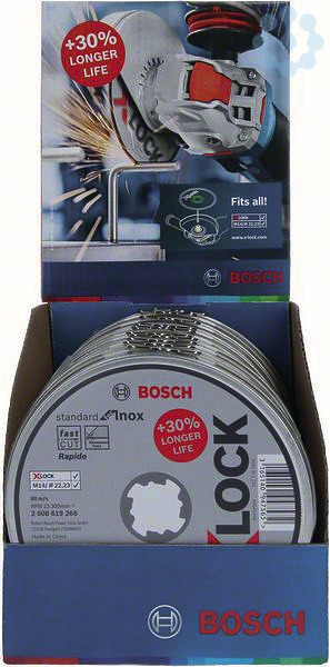 Die X-LOCK Trennscheibe Standard for Inox sorgt für zuverlässige Eigenschaften in Stahl. Die schmale Schneide der Scheibe sorgt für glatte Schnitte ohne großen Kraftaufwand. Zudem ist die Scheibe frei von Eisen, Schwefel und chlorierten Füllstoffen. Trennscheiben von Bosch erfüllen die höchsten Sicherheitsanforderungen wie EN 12413. Dank schlüssellosem X-LOCK System lassen sich die Trennscheiben schnell und bequem wechseln.