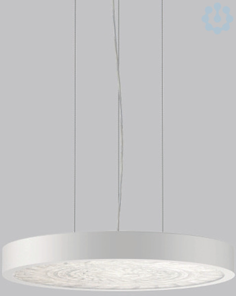 Dekorative runde LED Pendel-Flächenleuchte. Flacher nahtloser Rahmen Aluminium-Strangpressprofil pulverbeschichtet. Abdeckung Stahlblech pulverbeschichtet. Baldachin Aluminium pulverbeschichtet. Lichtaustritt über Diffusor aus handgefertigtem Farbglas FerroMurano weiß. Seitliche Lichteinkopplung (RZB SIDELITE®-Technologie) für überdurchschnittlich homogene Leuchtdichteverteilung und randlose Ausleuchtung. 3-Punkt Stahlseilabhängung stufenlos höhenverstellbar. Einfache Montage mit transparenter, kürzbarer Pendelleitung und Baldachin mit Magnetbefestigung. Betriebsgerät integriert.
