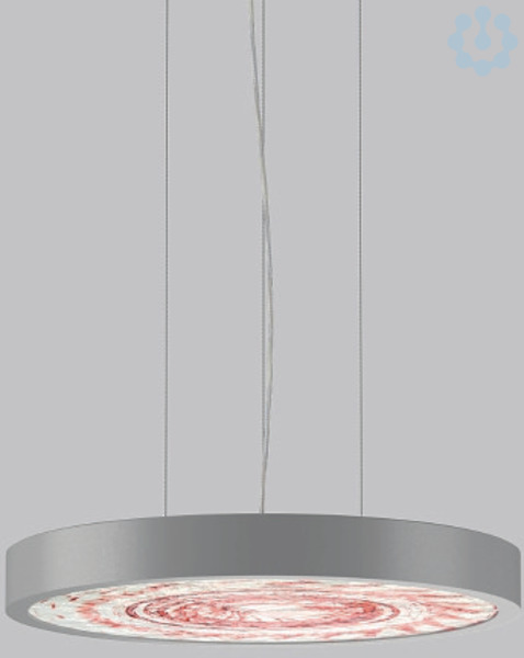 Dekorative runde LED Pendel-Flächenleuchte. Flacher nahtloser Rahmen Aluminium-Strangpressprofil pulverbeschichtet. Abdeckung Stahlblech pulverbeschichtet. Baldachin Aluminium pulverbeschichtet. Direkter Lichtaustritt über Diffusor aus handgefertigtem Farbglas FerroMurano rot. Indirekter Lichtaustritt über flächenbündigen Diffusor aus Kunststoff satiniert. Diffusor und Lightguide aus vergilbungsfreiem Kunststoff (PMMA). Seitliche Lichteinkopplung (RZB SIDELITE®-Technologie) für überdurchschnittlich homogene Leuchtdichteverteilung und randlose Ausleuchtung. Lichtaustritt direkt 70%, indirekt 30%. 3-Punkt Stahlseilabhängung stufenlos höhenverstellbar. Einfache Montage mit transparenter, kürzbarer Pendelleitung und Baldachin mit Magnetbefestigung. Betriebsgerät integriert.