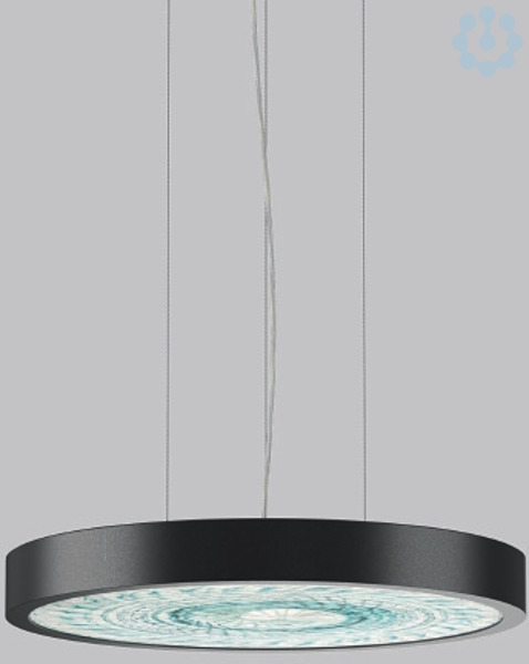 Dekorative runde LED Pendel-Flächenleuchte. Flacher nahtloser Rahmen Aluminium-Strangpressprofil pulverbeschichtet. Abdeckung Stahlblech pulverbeschichtet. Baldachin Aluminium pulverbeschichtet. Direkter Lichtaustritt über Diffusor aus handgefertigtem Farbglas FerroMurano blau. Indirekter Lichtaustritt über flächenbündigen Diffusor aus Kunststoff satiniert. Diffusor und Lightguide aus vergilbungsfreiem Kunststoff (PMMA). Seitliche Lichteinkopplung (RZB SIDELITE®-Technologie) für überdurchschnittlich homogene Leuchtdichteverteilung und randlose Ausleuchtung. Lichtaustritt direkt 70%, indirekt 30%. 3-Punkt Stahlseilabhängung stufenlos höhenverstellbar. Einfache Montage mit transparenter, kürzbarer Pendelleitung und Baldachin mit Magnetbefestigung. Betriebsgerät integriert.