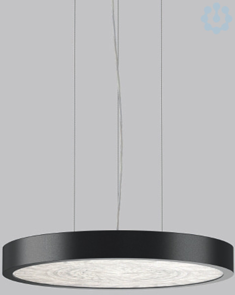 Dekorative runde LED Pendel-Flächenleuchte. Flacher nahtloser Rahmen Aluminium-Strangpressprofil pulverbeschichtet. Abdeckung Stahlblech pulverbeschichtet. Baldachin Aluminium pulverbeschichtet. Direkter Lichtaustritt über Diffusor aus handgefertigtem Farbglas FerroMurano weiß. Indirekter Lichtaustritt über flächenbündigen Diffusor aus Kunststoff satiniert. Diffusor und Lightguide aus vergilbungsfreiem Kunststoff (PMMA). Seitliche Lichteinkopplung (RZB SIDELITE®-Technologie) für überdurchschnittlich homogene Leuchtdichteverteilung und randlose Ausleuchtung. Lichtaustritt direkt 70%, indirekt 30%. 3-Punkt Stahlseilabhängung stufenlos höhenverstellbar. Einfache Montage mit transparenter, kürzbarer Pendelleitung und Baldachin mit Magnetbefestigung. Betriebsgerät integriert.